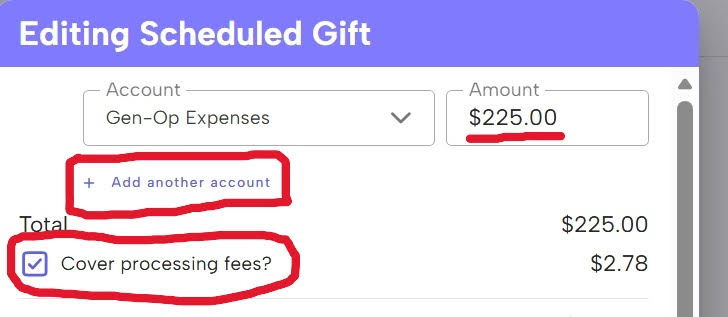 4. Here is where you can change your current giving for any account already listed or use ” + Add another account” to add giving to an account you do not already have listed. Please consider checking the box, “Cover processing fees?” which means you will pay the processing fee instead of coming out of the General Fund: